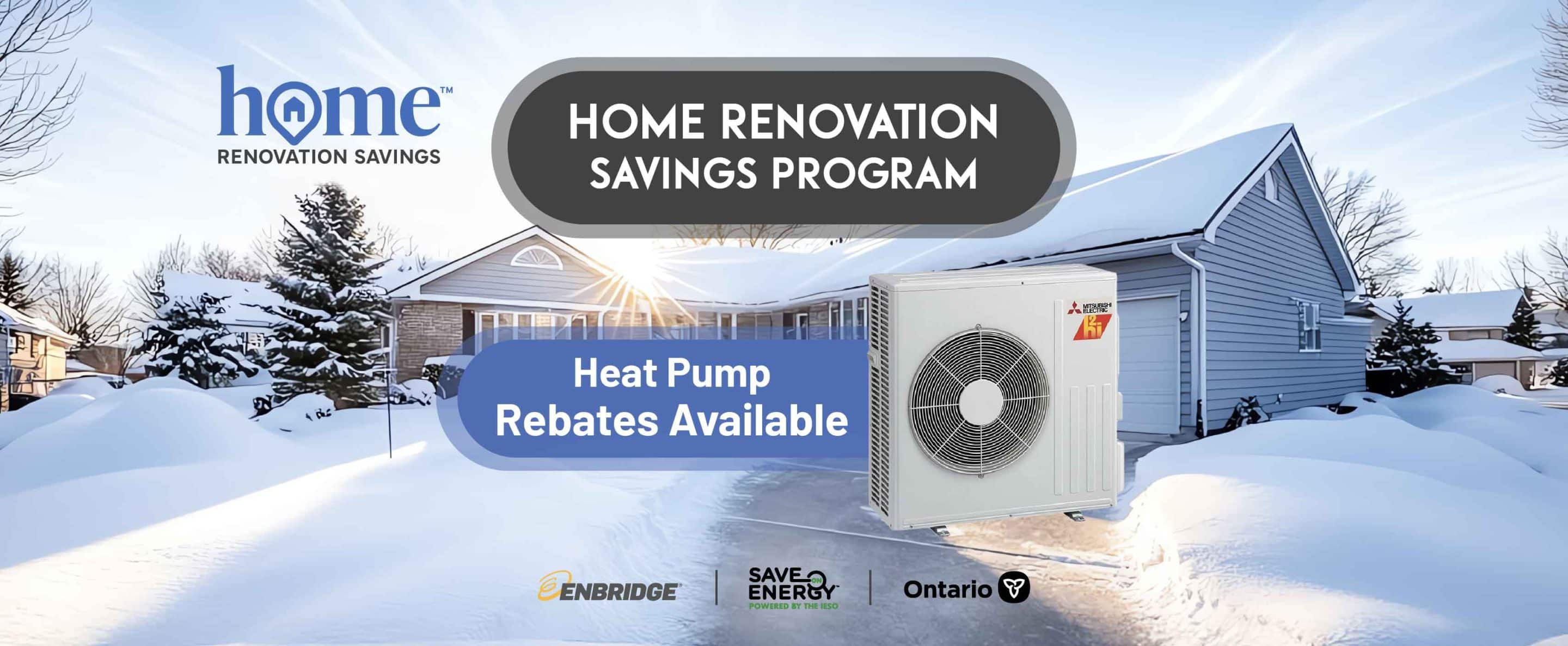 Upgrade to a high-efficiency heat pump and save with the Home Renovation Savings™ program! Enbridge Gas, Save on Energy, and the Ontario Government have partnered to offer significant rebates on eligible heat pump installations, making it more affordable than ever to improve your home’s comfort and energy efficiency. Choose single or bundled upgrades for even greater savings.